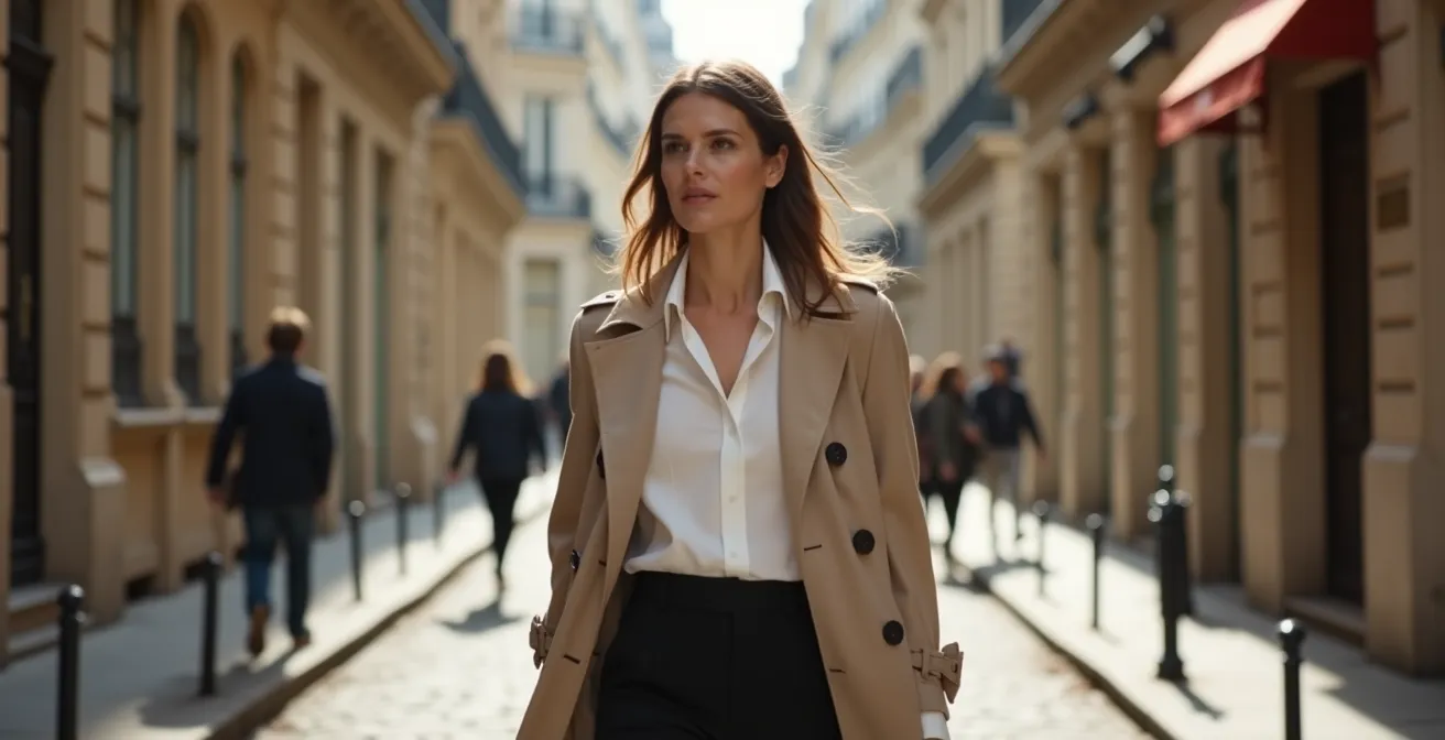 À l’inverse, les femmes plus grandes peuvent se permettre des longueurs plus importantes, qui ajoutent une touche de drame et de fluidité à la démarche. Le trench long, s’arrêtant à mi-mollet, accentue la verticalité et confère une élégance majestueuse. La ceinture, nouée (jamais bouclée) légèrement au-dessus de la taille naturelle, est l’autre secret : elle redéfinit le point de taille plus haut, allongeant ainsi optiquement les jambes, quelle que soit votre morphologie. Pour trouver la coupe parfaite, ce guide sur le dress code parisien offre des clés essentielles.