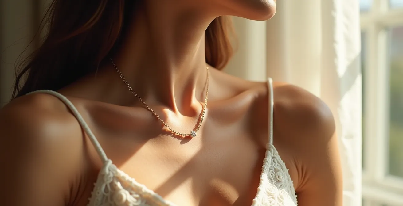 Le collier « princesse », avec sa longueur classique de 45 à 50 cm, n’est pas simplement un bijou ; c’est un instrument de précision. Il se pose exactement à la naissance du cou, juste au-dessus des clavicules. En termes de composition corporelle, il ne s’ancre ni sur le cou, ni sur le buste, mais précisément sur la ligne qui les sépare. Cet emplacement est stratégique : il crée un point de lumière horizontal qui souligne l’une des structures osseuses les plus délicates du corps féminin : la clavicule. Pour l’œil de l’observateur, c’est un signal de finesse, une ligne directrice qui met en valeur le port de tête et l’élégance de l’encolure.